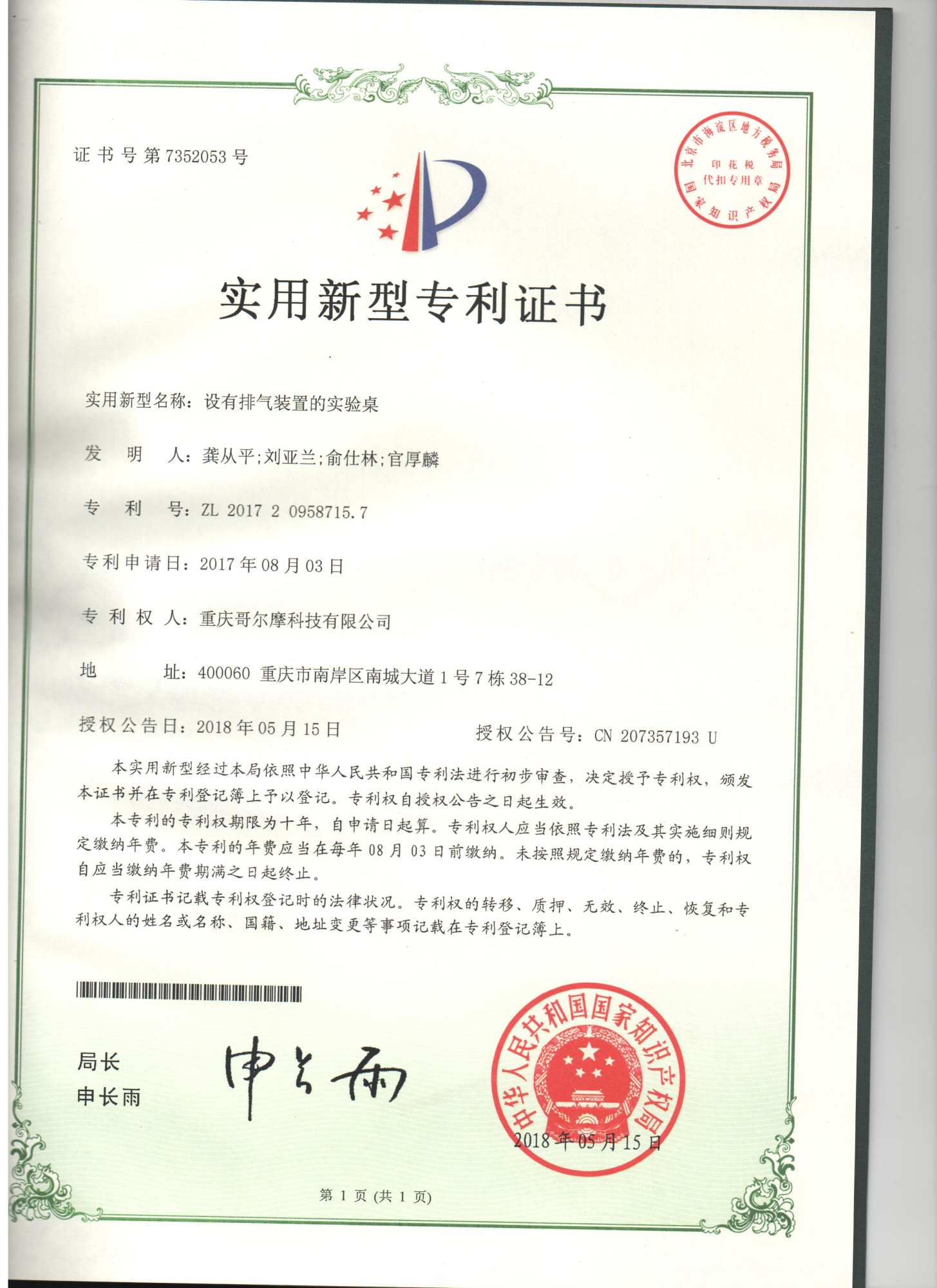 由重慶哥爾摩科技自主研發的“設有排氣裝置的實驗桌”、“自動排氣的圓形實驗桌”,近日取得了中華人民共和國國家知識產權局頒發的實用新型專利證書,體現了重慶哥爾摩科技有限公司研發人員及專業技術人員的科研能力和實驗創新能力,也證明出、公司的研發技術和實力獲得國家的認可與支持,新增實用新型專利既是我公司研發人員心血凝聚的結晶,也是公司科研創新實力的展示,在提升了公司的核心競爭力的同時,對公司的持續發展和品牌樹立有著重要的促進作用,標志著我公司在創新發展的道路上又邁出了堅實的一步。