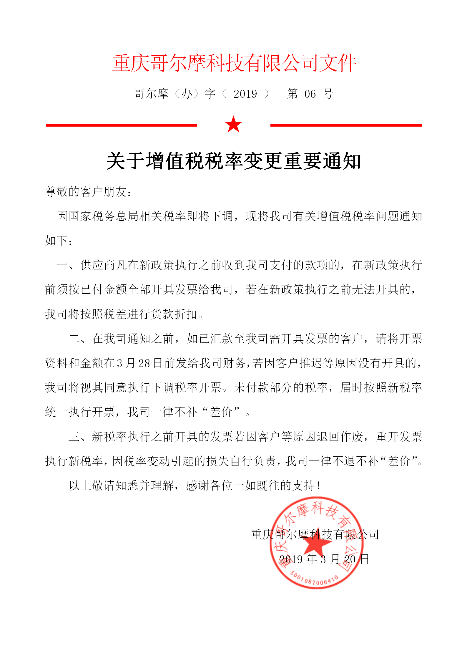 二、在我司通知之前,如已匯款至我司需開具發票的客戶,請將開票資料和金額在3月28日前發給我司財務,若因客戶推遲等原因沒有開具的,我司將視其同意執行下調稅率開票。未付款部分的稅率,屆時按照新稅率統一執行開票,我司一律不補“差價”。