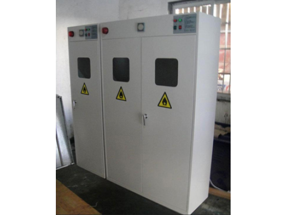 2.報警型氣瓶柜:專為存放可燃氣體而設計的。頂部增加了可燃氣體泄漏報警裝置。傳感器如檢測到可燃氣體泄漏,將會發出聲音和燈光報警,同時啟動頂風機排風。