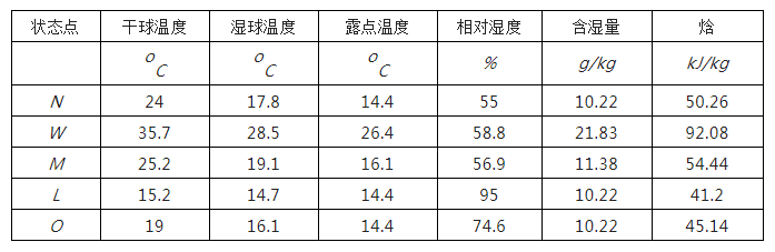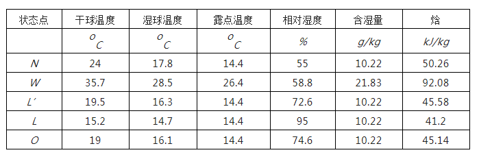 即可求出送風狀態點的焓值io =45.14 kJ/kg,過io作等焓線與熱濕比線(對于高熱型電子廠房,室內散濕量極少,主要散濕源為人體散濕,熱濕比線近似于垂直,所以對回風的處理不能是除濕過程)的交點即可得送風狀態點O。L點:連接室內點N與送風狀態點O,并延長與95%等相對濕度線相交,即得L點。M點:根據新回風混合,混合比等于新回風之反比,即NM/MW=新風量/回風量,即得M點。各狀點參數見下表: