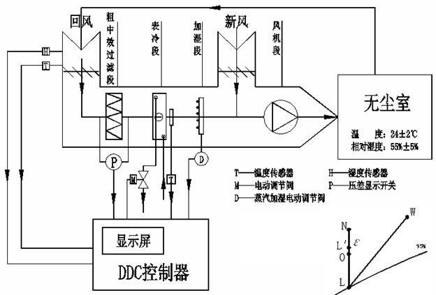 綜上分析,此種一次回風空氣處理方式僅適用于高熱少濕型潔凈室。對于低熱高濕型潔凈室不能僅依靠DDC控制,必須采用再熱,才得到相適的送風狀態點,為節約能源,建議采用采用二次回風方式(空氣調節教材上已有詳細敘述,故在此不再贅述)。